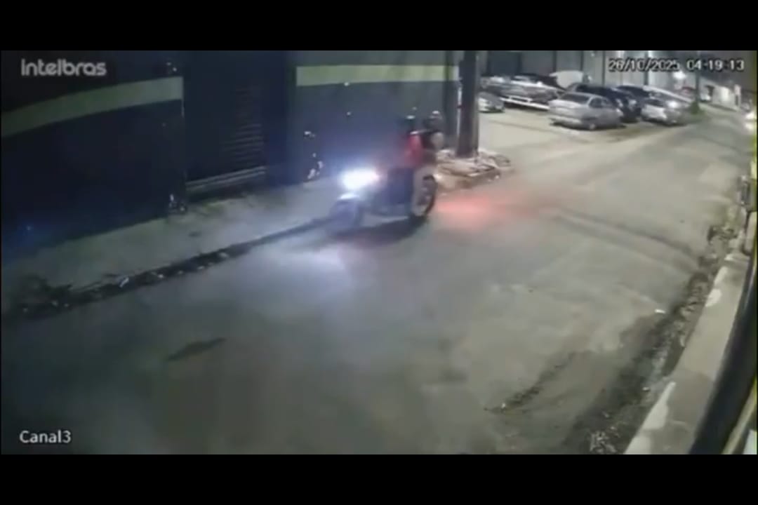 As imagens mostram o momento em que o casal, que trafegava em uma moto de cor escura, para em uma rua deserta. Imediatamente, são abordados por dois homens também utilizando capacetes. A ação é rápida e agressiva.