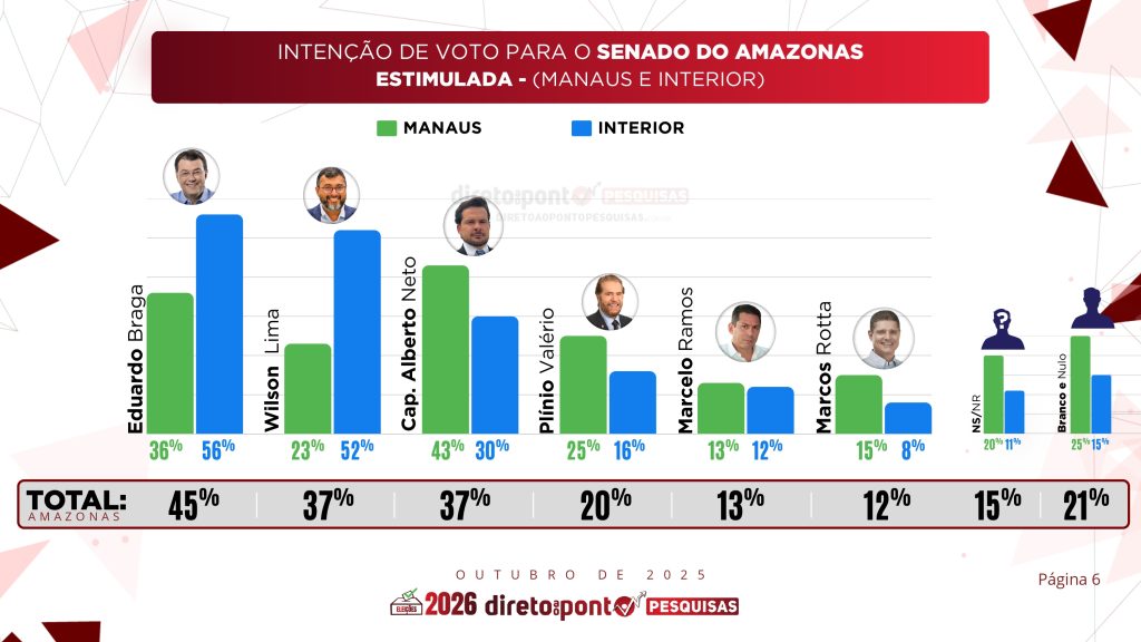 Na capital, Eduardo Braga lidera com 36%, Wilson Lima com 23%, Capitão Alberto Neto com 43%, Plínio Valério com 25%, Marcelo Ramos com 13% e Marcos Rotta com 15%. Outros 25% dos entrevistados declararam voto branco ou nulo, e 20% ainda não definiram em quem votar.