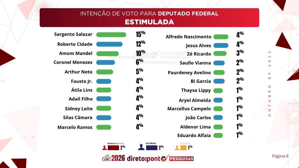 A pesquisa também sondou as intenções de voto para as 8 vagas do Amazonas na Câmara dos Deputados em 2026. O vereador Sargento Salazar (PL) lidera com 15% das intenções de voto, na modalidade estimulada, quando os entrevistados escolhem entre as opções apresentadas.