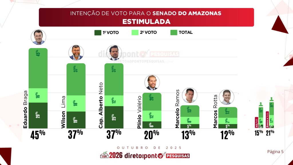 O senador Eduardo Braga (MDB) lidera as intenções de voto para o Senado Federal no Amazonas, com 45%, de acordo com uma pesquisa divulgada nesta terça-feira (21) pelo instituto Direto ao Ponto Pesquisas. Empatados com 37% estão Wilson Lima (União Brasil) e Capitão Alberto Neto (PL).
