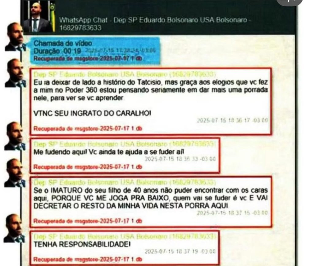 Incomodado, Eduardo reagiu em mensagens no WhatsApp. Ele voltou a citar o governador de São Paulo, Tarcísio de Freitas (Republicanos), figura que já havia sido alvo de críticas suas, e disparou contra o pai: “VTNC seu ingrato do caralh! Estou pensando seriamente em dar mais uma porrada nele, para ver se você aprende”*.