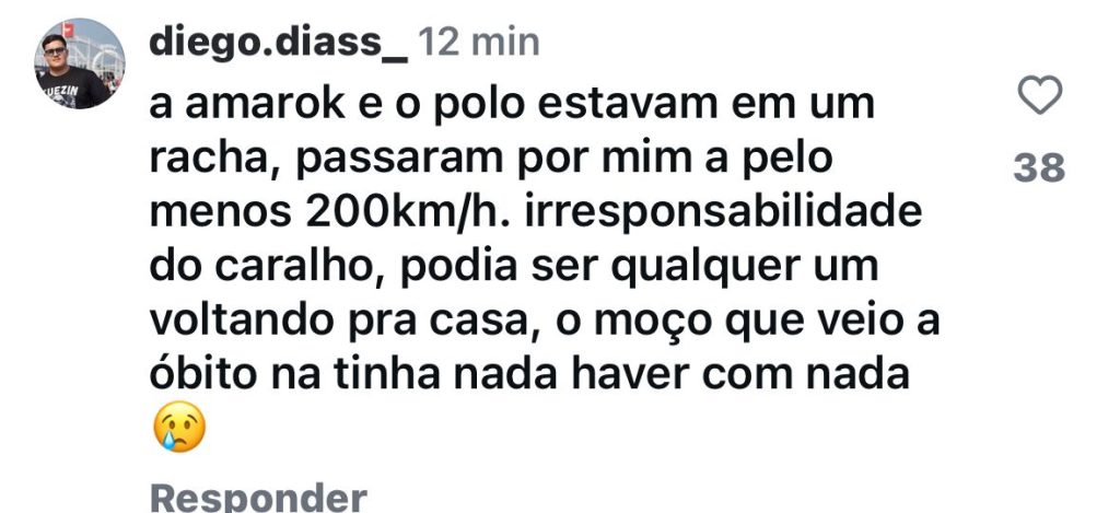 Um motorista que passou pelo local momentos antes do acidente comentou nas redes sociais que a picape Amarok e o Polo estavam em alta velocidade na pista, sugerindo que os veículos poderiam estar disputando um racha. Veja abaixo.