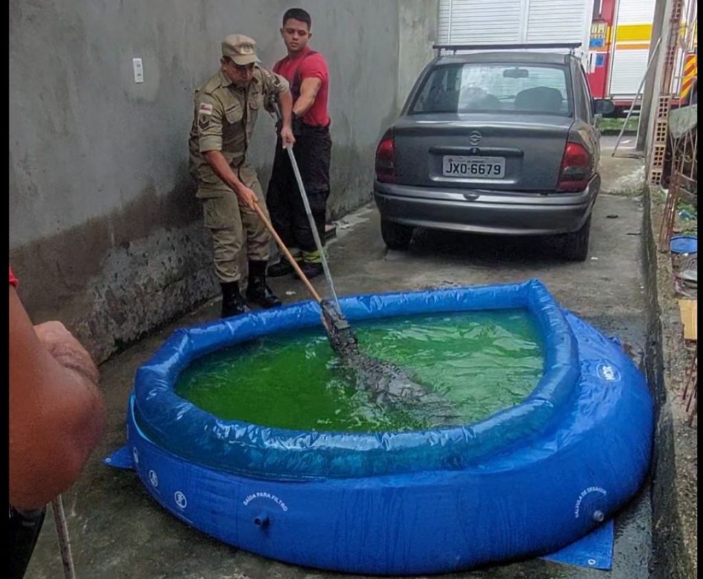 “Segundo a solicitante, eles iam limpar a piscina para encher novamente para as crianças brincarem e foi quando se depararam com o jacaré e ligaram para o 193”, explicou o Sargento Jonas, chefe da guarnição que atendeu a ocorrência.