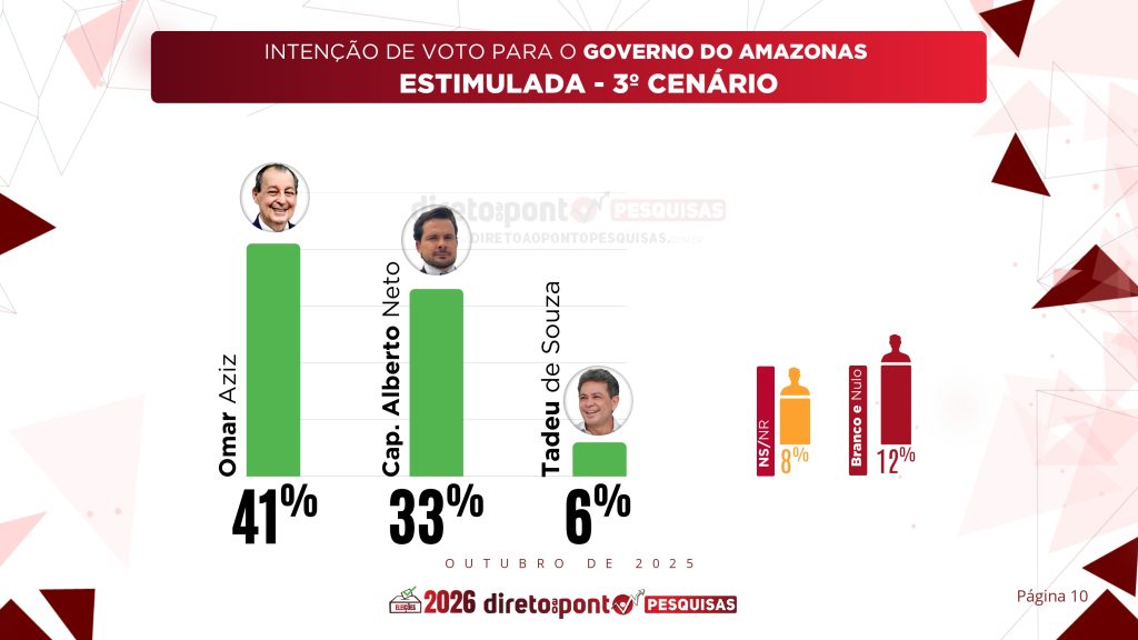 No terceiro cenário, que coloca Omar Aziz contra o deputado federal Capitão Alberto Neto, o resultado mostra Omar com 41% das intenções de voto, seguido por Capitão Alberto Neto com 33% e Tadeu de Souza com 6%. Brancos e nulos somam 12%, e 8% não responderam.