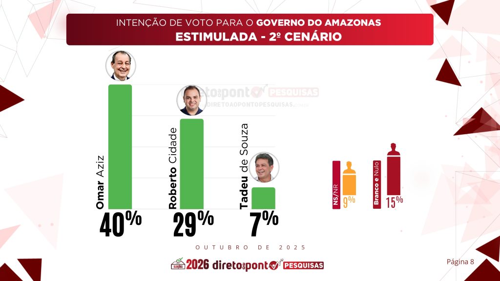 No segundo cenário geral, Omar Aziz lidera com 40%, seguido por Roberto Cidade, com 29%, e Tadeu de Souza, que tem 7%. Já os votos brancos e nulos somam 15%, enquanto 9% dos entrevistados não souberam ou não responderam.