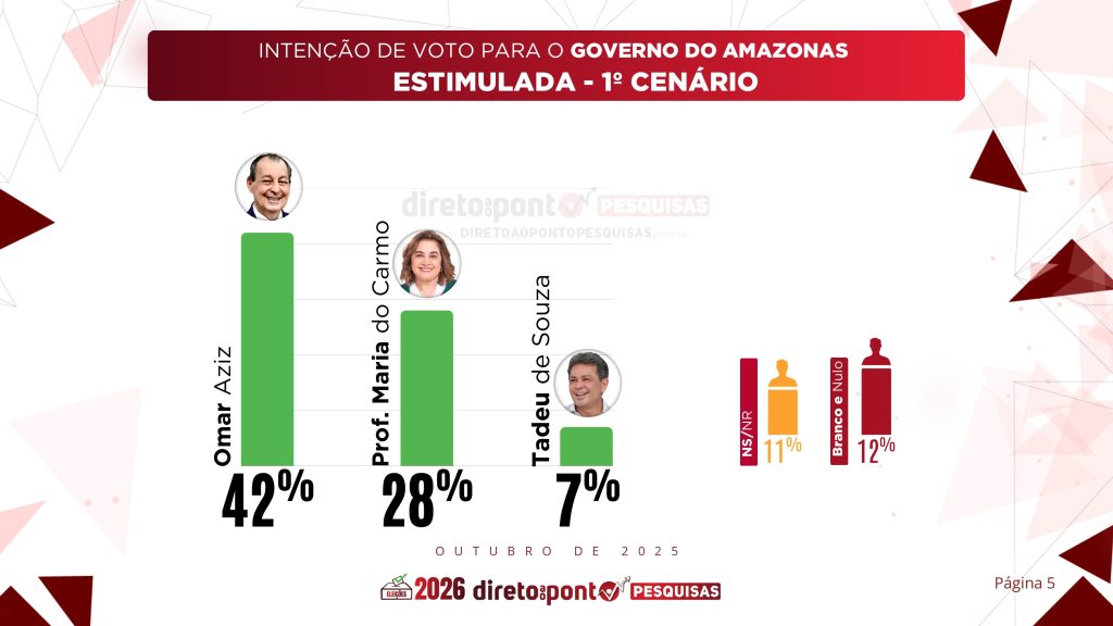 No primeiro cenário estimulado, Omar Aziz aparece com 42% das intenções de voto, seguido pela professora Maria do Carmo, com 28%, e pelo vice-governador Tadeu de Souza, que tem 7%. Já os votos brancos e nulos somam 12%, enquanto 11% dos entrevistados não souberam ou não responderam.