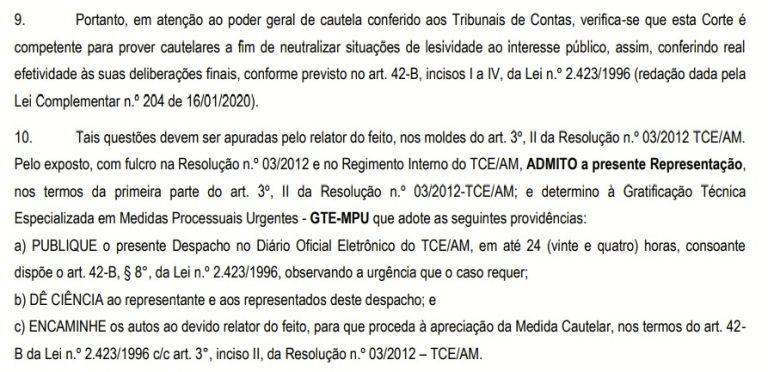 Com a admissibilidade da representação, o TCE-AM determinou:
