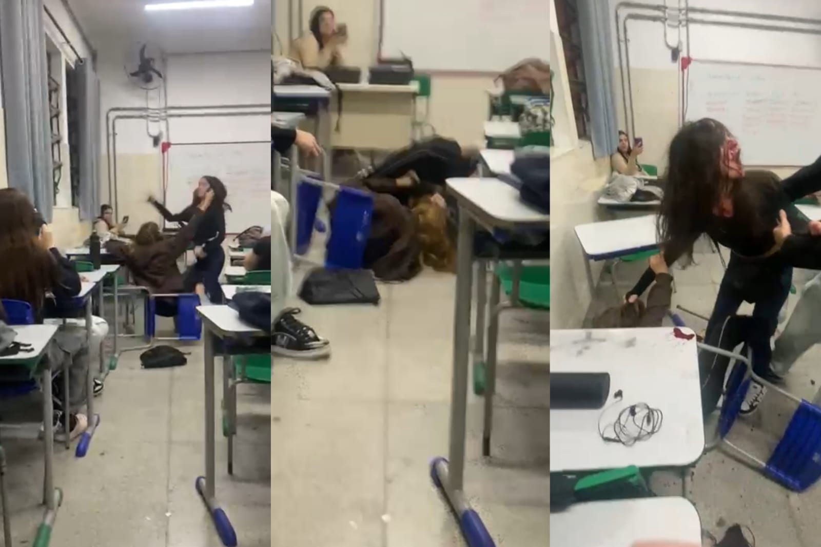 Nas imagens, é possível ver as duas alunas se agredindo fisicamente. Em determinado momento, a agressora, que estava no chão recebendo socos, pegou uma tesoura e atingiu o rosto da rival. A vítima ficou com o rosto ensanguentado, e a confusão foi interrompida por pessoas que estavam no local.
